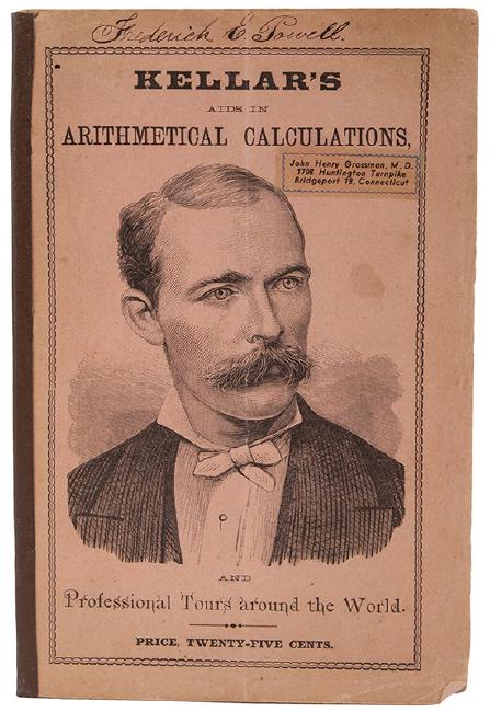 Kellar, Harry. Kellar’s Aids in Arithmetical Calculations. [Philadelphia]: Dunlap & Clarke, 1885. Pictorial wraps bearing an engraved portrait of Kellar. 32 pages. 8vo. Some wear and tape on wraps and end pages; good copy. Ownership signature of Frederick E. Powell on cover.