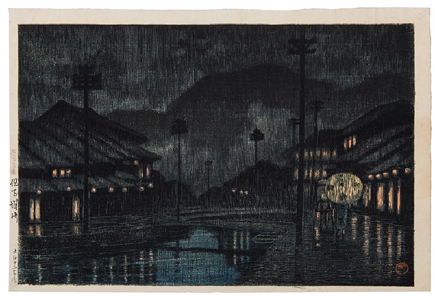 [Japan] Hasui Kawase. Three Woodblock Prints. Comprising Shirogasaki, Tajima Province, from series: Third Book of Souvenirs of Travels, 1926; Evening Moon at Magome (Suburb of Tokyo), 1930; and Rain at Omiya, 1930. Approx. 15 x 10" each.