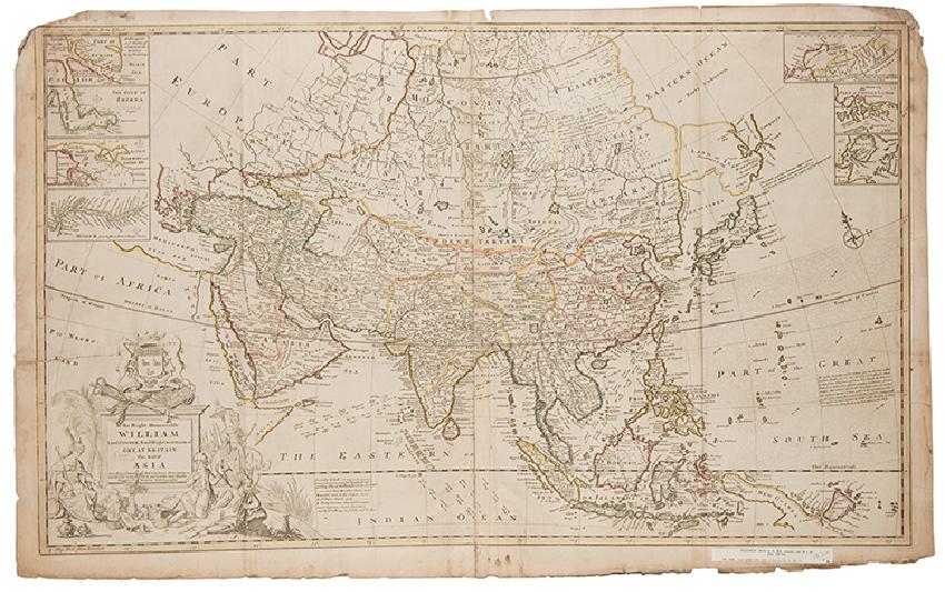 [Map] Moll, Herman. Map of Asia. London: H. Moll; and Tho. Bowles, ca. 1709—15. Engraved map hand-colored in outline. Folded. Approximately 25 x 39 ½". Inventory label affixed lower margin, pencil annotations; old repaired tears, light soiling, and foxing, mostly outside printed area, and other marginal wear.