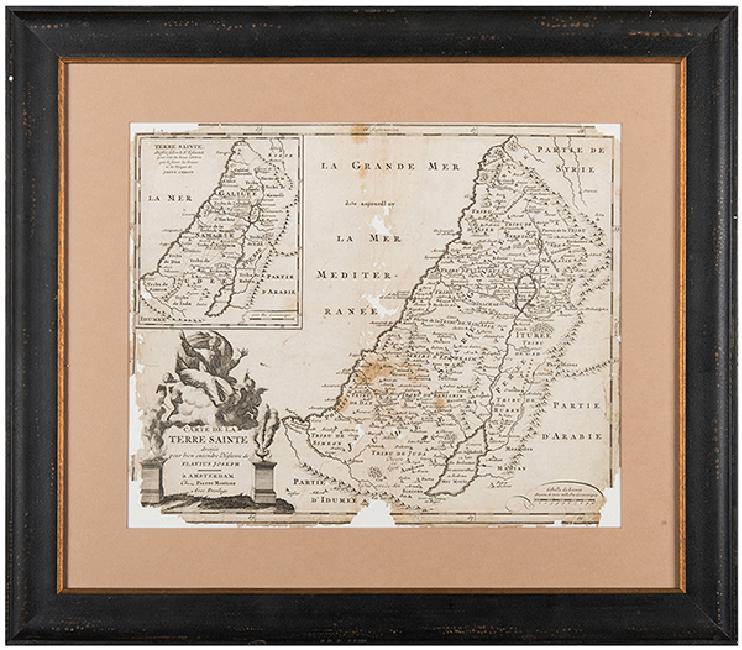 [Map] Map of the Holy Land. Amsterdam: Pierre Mortier, early eighteenth century. Copper engraving. Framed. Matted area 11 ½ x 14". Heavy losses and staining centrally and around edges.