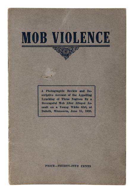 [Crime] Mob Violence. A Photographic Review and Descriptive Account of the Appalling Lynching of Three Negroes By a Revengful Mob After Alleged Assault on a Young White Girl, at Duluth, Minnesota, June 15, 1920. Duluth, MN: Duluth Publishing Co., 1920. Profusely illustrated with black and white photographs. Printed paper wraps. Thin 8vo. Exceedingly scarce.