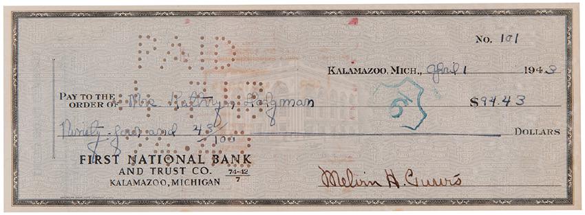 Purvis, Melvin. Signed personal check. In the amount of $94.43 to Mrs. Kathryn Hodgman. Kalamazoo, MI, April 1, 1943. First National Bank and Trust Co. Housed in plastic case. PSA/DNA authenticated, graded NM - MT 8.