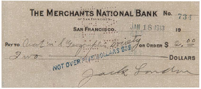 London, Jack. Signed personal check. In the amount of $2.00 to the National George Geographic Society. Merchants National Bank of San Francisco. Housed in a plastic case. PSA/DNA authentication, grade NM-MT 8.