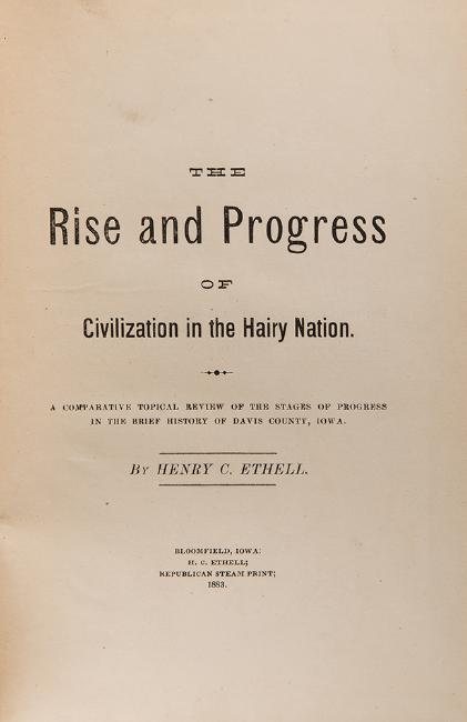 Ethell, Henry C. Rise and Progress of Civilization in Hairy Nations. Bloomfield, IA: by the Author, 1883. Inscribed in pencil on the f.f.e.p. To Rev. A.W. Haines. Publisher's blue gilt-lettered cloth. Thin 8vo. Howes E208; Graff 1266.