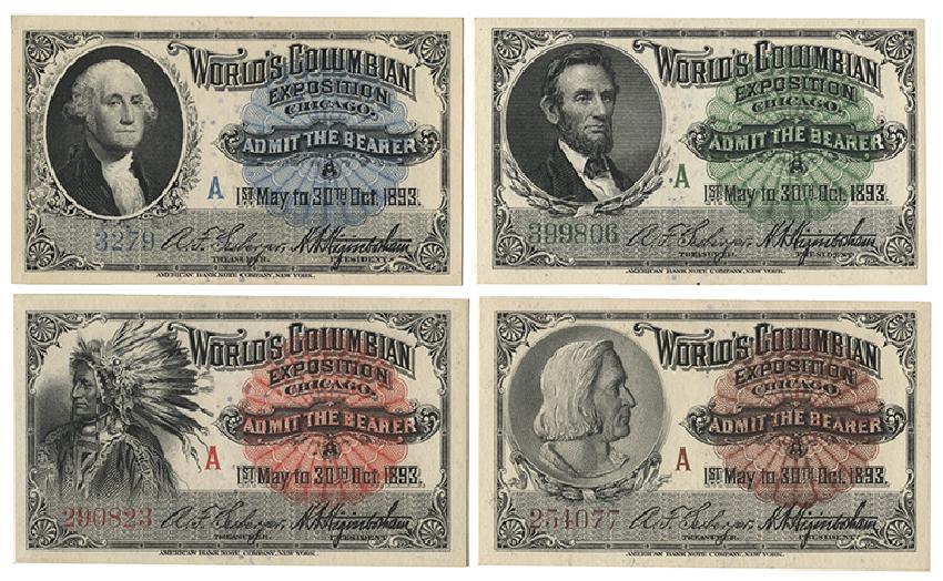 [Columbian Exposition] Four Tickets to the 1893 World’s Columbian Exposition. New York: American Bank Note Company, 1893. Crisp set of four tickets bearing portraits of Columbus, Lincoln, Washington, and a Native American. Approx. 2 ½ x 4".