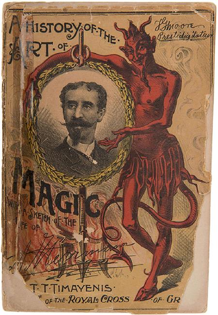 Timayenis, T. A History of the Art of Magic, With a Sketch of the Life of A. Herrmann. New York: Minerva Publishing, 1897. Colored pictorial wraps, engraved frontispiece. 135pp + 2 leaves Peck & Snyder advts. 8vo. Spine perished yet binding intact; front cover detached along old tape repair; edges chipped. Fair.