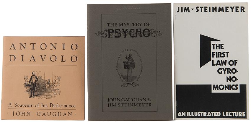 Steinmeyer, Jim and John Gaughan. Trio of Magic Monographs. Including Antonio Diavolo (1986; one of 500 copies; signed by John Gaughan, with a group of snapshots of the author with Dr. Grossman in a tipped-in envelope); The Mystery of Psycho (1987; number 145 of 500 copies, inscribed and signed by the authors to Grossman); and The First Law of Gyronomics (1988; inscribed and signed by Steinmeyer to the previous owner). Fine.