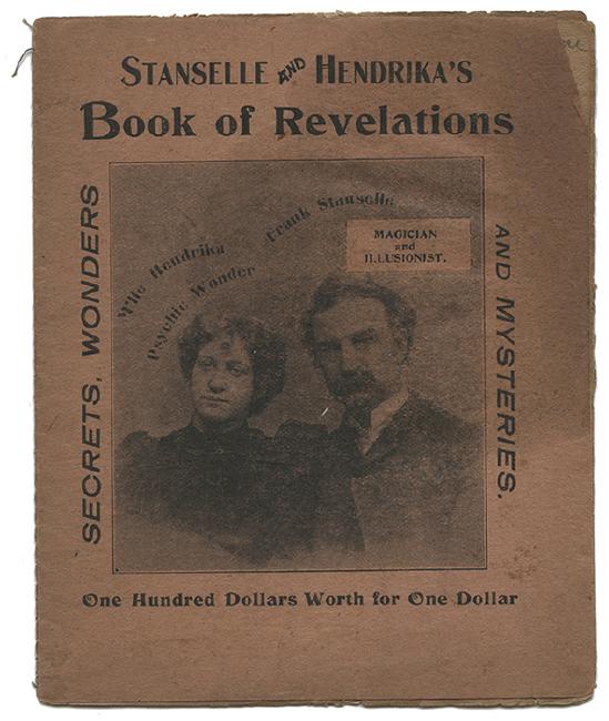 Stanselle and Hendrika’s Book of Revelations. Chicago [?], ca. 1910s. Pictorial wrappers depicting the magicians. 16mo. p. 1—16. Inscribed on the first page: “To F.E. Powell/ Compliments of Mrs. H.J. Burlingame/ Syracuse, Ind./ Oct. 1915.” Minor chipping around edges.