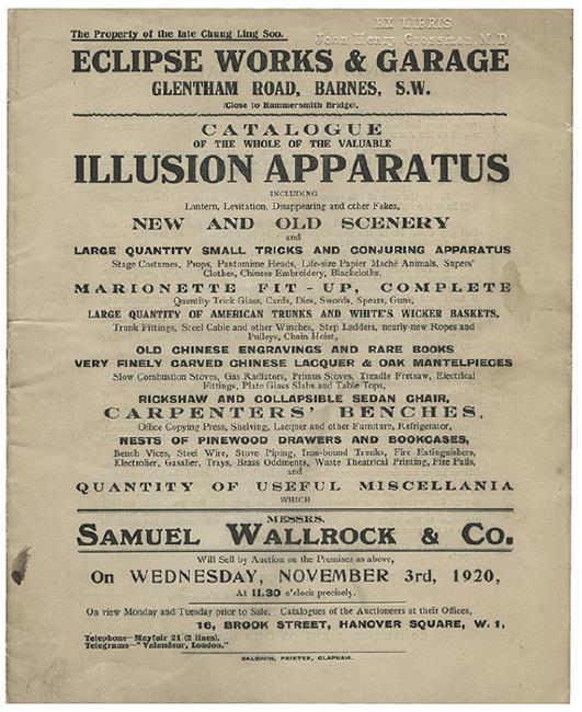 Chung Ling Soo (William Ellsworth Robinson). Catalogue of the Whole of the Valuable Illusion Apparatus of the Late Chung Ling Soo. London, 1920. Original printed wrappers. p. [3] 4—20. 8vo. Fine. A scarce catalog, and the first we have seen with annotations of all prices realized and, in some cases, the identities of the high bidders. Original purchasing slip tipped-in. With a letter from the previous owner, George Jenness, to Grossman, concerning the sale of this copy.