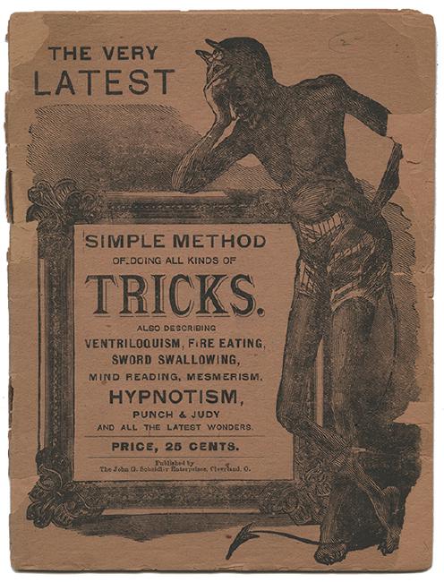 Scheidler, John. The Very Latest Simple Method of Doing All Kinds of Tricks. Cleveland: The John G. Scheidler Enterprises, ca. 1876. Pictorial wrappers. Woodcuts. 8vo. Considerably chipped and worn; fair. Uncommon. Not in Toole Stott.