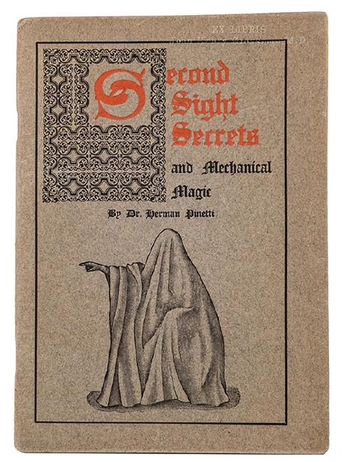 Pinetti, Herman. Second Sight Secrets and Mechanical Magic. Bridgeport: The Dunham Press, 1905. Dark grey pictorial wraps. 12mo. p. 6—52. Fine. Explaining secrets of table tipping, levitation, and second sight codes.