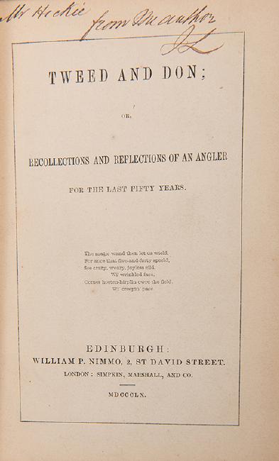 [Sport. Angling] Locke, James. Tweed and Don; or, Recollections and Reflections of an Angler for the Last Fifty Years. Edinburgh: William P. Nimmo, 1860. Inscribed by the author. Original green cloth stamped in gilt and blind. Publisher's advertisements tipped in at f.f.e.p. 12mo. Hinges cracked and starting to detach. Binding frayed at the spine edges. Small bookseller's stamped to front and binder's stamp to rear pastedowns.