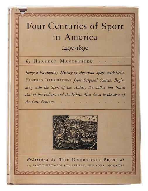 [Hunting] Manchester, Herbert. Four Centuries of Sport in America. New York: The Derrydale Press, 1931. Limited edition. One of 850 copies. Publisher's maroon cloth lettered in gilt with inset black and white illustration "The Sportsman." Dust jacket. 8vo. Fine.
