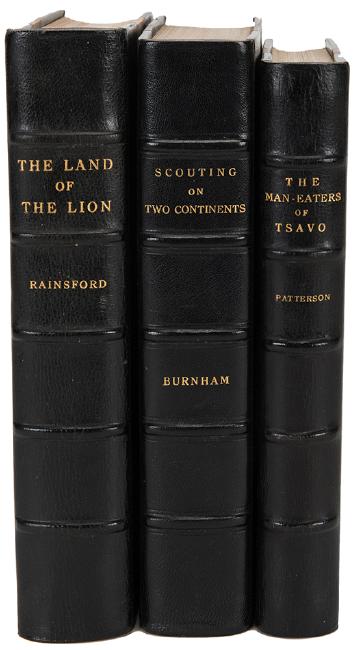 [Africa] A Group of Three Works in Matching Binding. Includes: The Land of the Lion. By W.S. Rainsford. New York: Doubleday, Page, 1909; The Man-Eaters of Tsavo and Other East African Adventures. By Leut.-Col. J.H. Patterson. London: Macmillan, 1926; and Scouting on Two Continents. By Frederick Russell Burnham. Garden City, NY: Doubleday, Page, 1927. Three volumes. 3/4 navy morocco over marbled boards. Gilt-lettered spines. Marbled endpapers. T.e.g. 8vo.