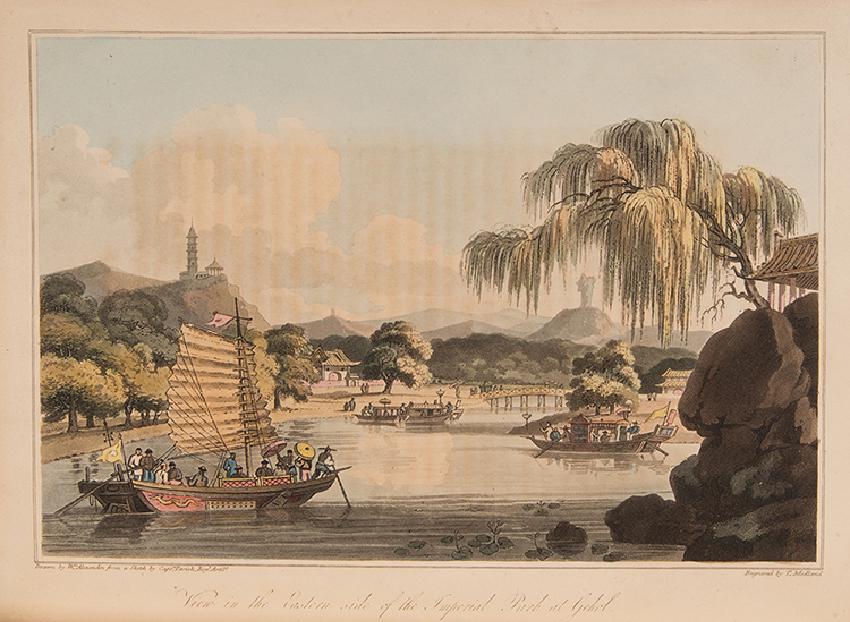 [China] Barrow, John. Travels in China. London: T. Cadwell and W. Davies, 1806. Second edition. Eight plates (five hand-colored, two double-page), including frontispiece. Contemporary mottled calf. 4to. Hinges reinforced. Rubbing to boards. Some foxing. Abbey Travel 531; Tooley 84.