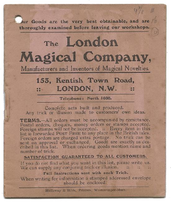 The London Magical Company. London, ca. 1910s. Pink printed wrappers. 16mo. Unpaginated gathering of 8 leaves, with descriptions of more than 80 magic tricks. Light soiling.