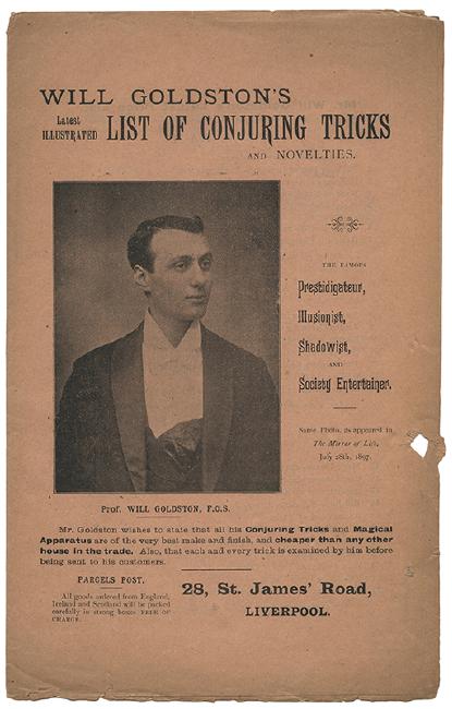 Goldston, Will. Goldston’s List of Conjuring Tricks and Novelties. Liverpool, ca. 1897. Pictorial self-wrapped catalog on pale orange paper, bearing a photographic portrait of the young professor of magic. Illustrated. 8 pages. Marginal tear along right side. With a supplementary list of the same period, bearing the same image of Goldston. Rare.