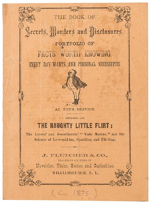 J. Fletcher & Co. The Book of Secrets, Wonders and Disclosures. Williamsburgh, N.Y., ca. 1870s. Orange pictorial wrappers. Illustrated. 8vo. 62 pages. Including parlor magic sets, a blow book, magic playing cards, fire-eating set, and other tricks, plus other goods and novelties.