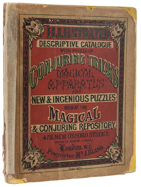 Mr. Bland’s Illustrated Catalogue of Conjuring and Magical Apparatus. London, ca. 1867. Colored pictorial wrappers. Colored endsheets. All edged gilded. Profusion of illustrations. Square 8vo. Corners bumped, extremities chipped. Ex libris Stanley Collins. Rare. Letters of endorsement reproduced at the rear of the catalog are from none other than Herrmann and Heller, and date to 1866 and 1865, respectively. Two pages of notes regarding the catalog, in Dr. Grossman’s hand, accompany the volume. An early, rare, and important conjuring catalog.