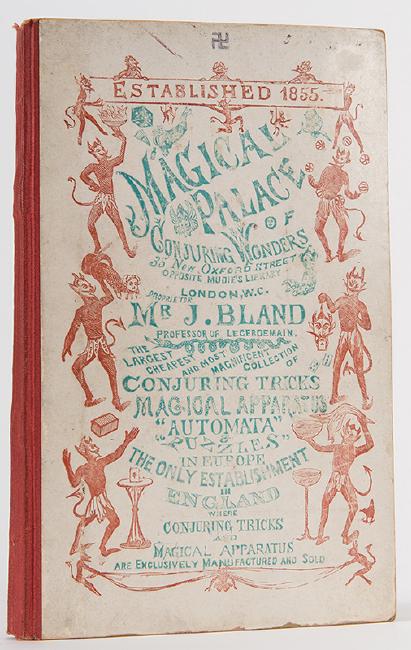 J. Bland’s Magical Palace of Conjuring Wonders. London, ca. 1890s. Original cloth-backed pictorial boards. Illustrated. 8vo. p. [1—6] 7—144 (bound-in supplement paged 134—44) + 1 leaf. With two contemporary illustrated supplements, 8 and 12 pages. Hinges cracking, scattered minor internal wear, light scuffing to boards.