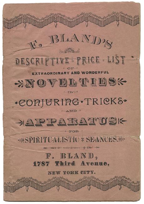 F. Bland’s Descriptive Price List. Novelties in Conjuring Tricks and Apparatus for Spiritualistic Séances. New York, ca. 1880s. Pink printed wrappers. Illustrated. Unpaginated gathering of six leaves, describing 77 pieces of apparatus, many trading on the names and effects of popular magicians of the day including Kellar, Heller, Dr. Lynn, Hoffmann, Herrmann, Dobler, Verbeck, and De Kolta. Covers brittle with closed horizontal tears.