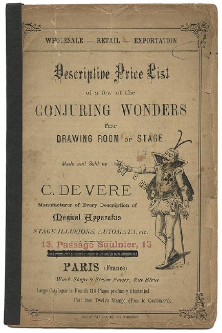 DeVere, Charles. Descriptive Price List of a Few of the Conjuring Wonders for Drawing Room or Stage. Paris, ca. 1900s. Pictorial wrappers. Illustrated. English text. 12mo. 24 pages. Wraps chipped and torn, spine reinforced.
