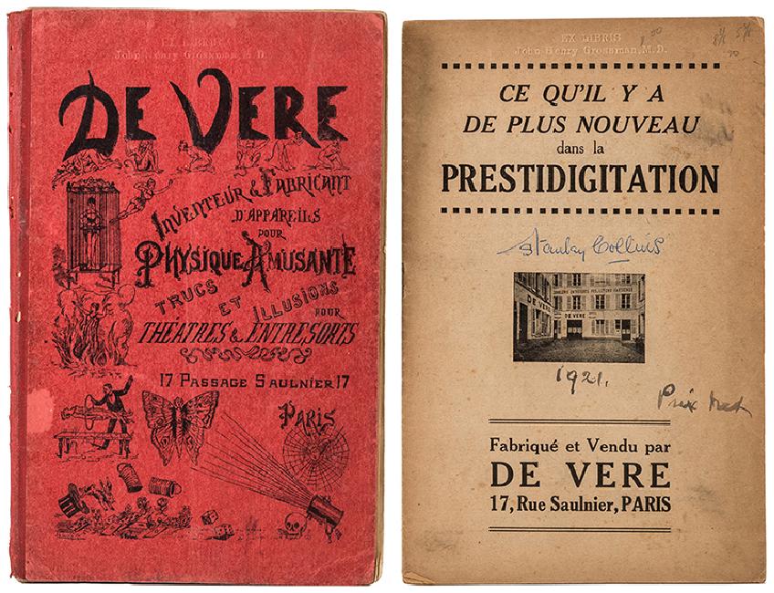 DeVere, Charles. DeVere Inventeur et Fabricant D’Appareils Physique Amusante. Paris, ca. 1900s. Cloth-backed red pictorial wraps, illustrated profusely. 8vo. 120 pages. Binding weak, else very good. With a second catalog, bearing inked date 1921, with the ownership signature of Stanley Collins.