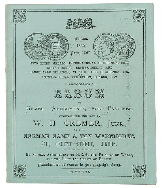 Cremer, W. H. Album of Games, Amusements, and Pastimes. London: W.H. Cremer, ca. 1868. Pale green pictorial wrappers, profusion of woodcuts. 128 pp. Small 8vo. Rear wrapper lacking, else very good. Scarce. The first 88 pages describe and depict games and toys manufactured by Cremer. A separately-numbered section of 40 pages outlines the magic tricks and stage illusions Cremer also manufactured.