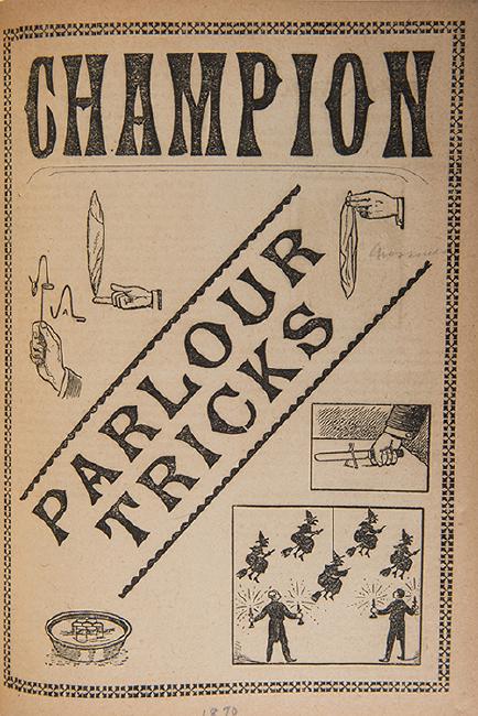 Champion Parlour Tricks. London, ca. 1870. Original wraps bound in blue cloth with gilt-lettered spine. Ageing of pages as expected; very good. Parlour tricks, spiritualist effects, and props for sleight-of-hand.