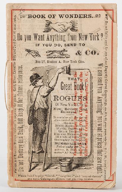 B. Fox & Co. Book of Wonders. New York, ca. 1870s. Publisher’s pictorial wrappers. Illustrated. 16mo. 16 leaves incl. covers. Marked cards, Enchanted Bottle trick, and numerous novelties and other goods.