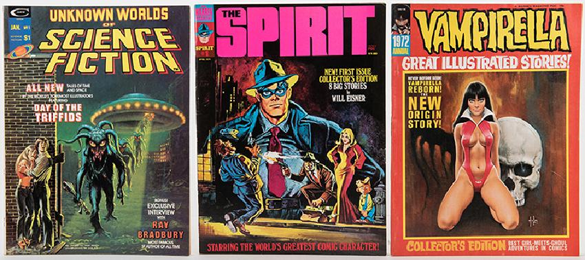 Lot of 51 Vintage Horror, Fantasy, and Adventure Magazines. Warren or Curtis, 1970s—80s. Including Eerie Nos. 30, 40, 54, 55, 74, 86; Creepy Nos. 36, 46, 73, 76, 77, 79, 81, 86, 89; Vampirella 7, 11, 51, 62, and 1972 Annual; Dracula Lives! Nos. 1, 2; Deadly Hands of Kung Fu Nos. 1—3; Unknown Worlds of Science Fiction 1, 2, 3, 6 and "Special" No. 1; Land That Time Forgot No. 1; 1984 No. 5; The Spirit (Will Eisner) Nos. 1—10 (several duplicates) 13, 14, and "Spirit Special"; and Doc Savage Nos. 1, 3. Condition very good overall. Individually bagged and boarded. Nice lot.