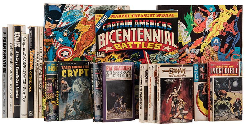 Lot of Over 25 Comic-Related Treasuries and Other Publications. Including Origins of Marvel Comics (1974) by Stan Lee; Steranko History of Comics Vols. 1—2 (1970/72) Sex in Comics Vols. 1—3 (1971) by Gilmore; Art of Walt Disney (1973); Fantastic Art of Frazetta Books 1, 2 (1975); Tarzan of the Apes (1972) by Hogarth; Carl Barks and the Art of the Comic Book (1981); Comix: A History… (1971); Marvel or DC treasuries (1970s) of Captain America, Shazam!, Conan the Barbarian, Tarzan, Detective Comics, and Hulk; and a stack of eight paperback science fiction and horror titles, including Tales from the Crypt No. 1 (Ballantine, 1964).