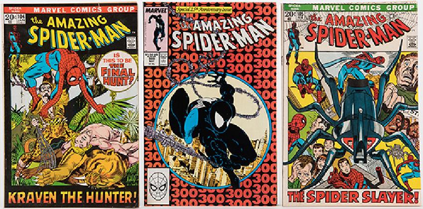 [Spiderman] Lot of 55 Comic Books from "The Amazing Spiderman" and Other Series. Consisting of 37 issues of Amazing Spiderman, comprising: 79, 82, 83, 100, 102—109, 111, 112, 114—119, 124, 127, 281, 282, 291, 298 [two copies], 299, 300, 303, 306—315; Marvel Tales (starring Spiderman) Nos. 25, 26, 28—30, 32—34; "King Size Special" 7, 8; Marvel Team-Up Nos. 1, 2, 4, 16; Spiderman and the Hulk (Chicago Tribune supplement); Sensational Spiderman (1988, two copies); and Spectacular Spiderman (July, 1968). Condition varying from POOR to VF, with several early issues heavily soiled and ragged.