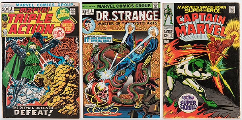 Large Lot of 186 Silver and Bronze Age Marvel and DC Comics. Numerous series represented, mostly Marvel, including Incredible Hulk Nos. 106, 109 [both poor]; Silver Surfer Nos. 2, 13, 15, 16, 18; Ka-Zar (17 misc. issues); Defenders No. 1 [Aug.], No. 1 [Dec.], 2 [Mar.] , 3 [June]; Combat Kelly Nos. 1—4, 6 [two copies N1]; Sub-Mariner Nos. 4, 7, 8, 12, 14, 15, 22, 23, 53, and "Special" No. 2; Tomb of Dracula Nos. 1—4; Dr. Strange Nos. 177, 179, 181; Savage: The Man of Bronze Nos. 1—7 [two copies N6]; Kull the Conqueror Nos. 1—23, 26; The Shadow Nos. 1—5 [three copies N1, two copies N5 and N2] Luke Cage, Hero for Hire Nos. 2—5, 7, 8; Rima the Jungle Girl Nos. 1—3, 5—7; Marvel Spotlight No. 3 (Werewolf by Night); Werewolf by Night No. 1; Outlaw Kid No. 3; Monster of Frankenstein No. 2; The Eternals Nos. 2, 3, 6; Supernatural Thrillers Nos. 1—3; Shanna the She-Devil No. 1; Chamber of Darkness No. 7; Adventure Into Fear No. 10; Captain Marvel Nos. 2, 13, 17, 21, 22, 36; Marvel Triple Action Nos. 2, 4; Master of Kung Fu No. 15, 16, 19, 23, 25—27, 37, 50; Logan’s Run Nos. 2, 3; Tower of Shadows Nos. 7, 8; Strange Tales Nos. 170, 171, 177; Marvel Superheroes Nos. 16, 24, 27—29, 31, 36; Red Wolf Nos. 1, 2; Marvel Premiere No. 1 [Warlock], 19 [Iron Fist]; Marvel Premiere/Dr. Strange No. 1—6, 12; Astonishing Ant-Man Nos. 4—8; and eight others. Bagged and boarded. Not individually inspected. Should be seen.