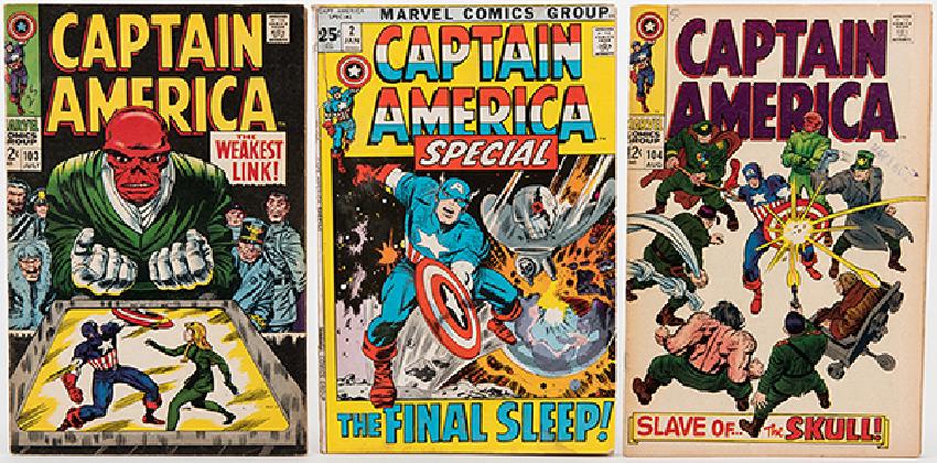 Captain America. Lot of 48 Comic Books. Marvel, 1968—1975. Including Nos. 103, 104, 108, 114, 115, 117—119, 122, 123, 125, 127—150, 152, 152, 155, 156, 158, 159, 160, 165, 173, 174, 182, and 184; and "Special Annual" No. 2. Condition varying from approximately FR—FN. A minority (approximately 8 copies) water-stained, with heavy damage to rear covers.