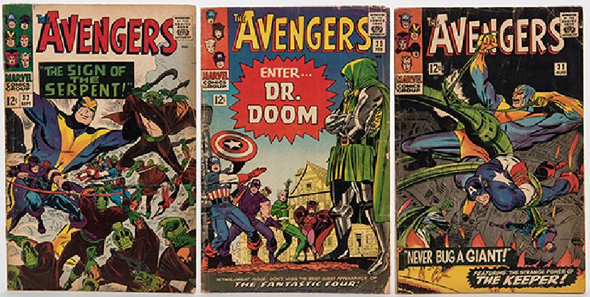 The Avengers. Lot of 45 Comic Books. Marvel, 1966—89. Including Nos. 25, 31, 32, 37, 39—42, 51, 55, 56, 58, 59, 60, 62, 67, 68, 71, 77, 77—82, 93—103, 106 (two copies), 107, 110, 117, 130, 153, 300, and 301; and "King Size Special" No. 4. Individually bagged and boarded. Condition varying from approximately GD—VF. Not individually inspected.