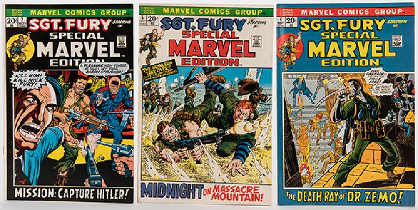 Sgt. Fury and His Howling Commandos. Lot of 123 Comic Books. Marvel, 1963—74. A spectacular collection from a single owner, consisting of Nos. 4—91 [with duplicate copies of 25, 62, 73], 93—108, 110, 112, 116, and 117—120. Plus "Special Marvel Edition" 5—7, and "King Size Annual" 1—7. Individually bagged and boarded. Earlier issues generally VG or better, later issues generally VF or better. Not individually inspected. Should be seen.