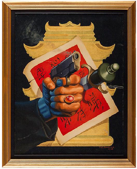 [Gibson, Walter] Hamilton, Franklyn E. Original Oil Painting on Canvas. Featuring a hand shooting a pistol and a sword through a sheet of Chinese script, with a Chinese temple in the background, signed ("F.E. Hamilton") and dated ("6-68") lower right. Framed. Repaired tear to the right edge. 21 1/2 x 18". Notecard mounted on verso inscribed and signed by Hamilton to Gibson, wishing him and his wife well and informing him of receipt of a Houdini Scrap Book, 7/28/76.