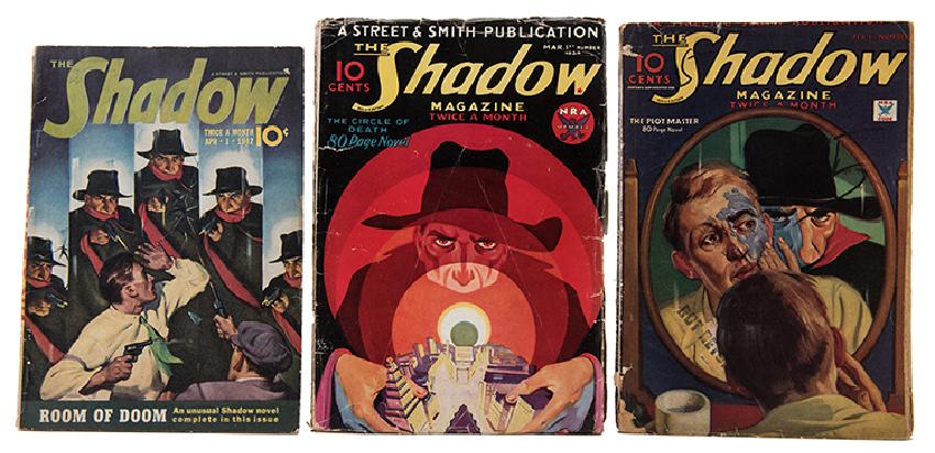 Gibson, Walter. The Shadow. Lot of 20 Pulp Magazines. Street & Smith, 1934—43. Miscellaneous issues from the bi-monthly series, including Mar. 1, 1934; June 1, 1934; Feb. 1, 1935; Mar. 1, 1935; Oct. 15, 1935; Deca. 1, 1938; July 15, 1939; Nov. 15, 1939; Feb. 15, 1940; Mar. 1, 1940; Mar. 15, 1940; Apr. 15, 1940; June 15, 1940; Jan. 1, 1941; Feb. 1, 1941; July 1, 1941; Feb. 1, 1942; Apr. 1, 1942; Nov. 15, 1942; and Apr. 1943. Worn and chipped covers, several torn or cracked spines, but overall condition good.