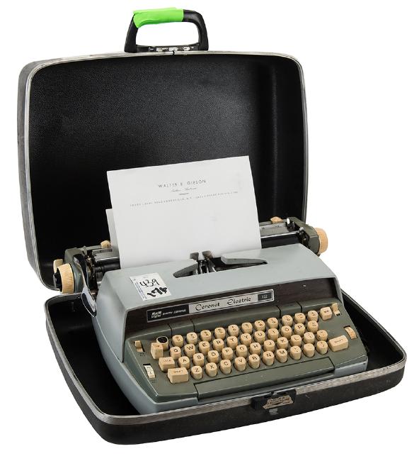 Gibson, Walter. A Smith-Corona Typewriter Owned and Used by Gibson. A gray-bodied Smith-Corona Coronet Electric typewriter, housed in the original locking travel case with key, obtained from Gibson’s estate in an auction of his personal belongings held on April 16, 1994 in Kingston, New York (sale tags affixed). Accompanied by a Supergraphics COA endorsed by Jim Steranko, stating that "the machine… is from the Gibson estate, originally owned and used by the writer to generate copy for his many works." Together with two typed pages from a true-crime story by Gibson also mentioned on the COA, and related ephemera including examples of Gibson’s personal letterhead and return envelope, a flyer and brochure for Gibson’s magic show, and the Gibson memorial issue of Pulp Collector (Wtr. 1986).