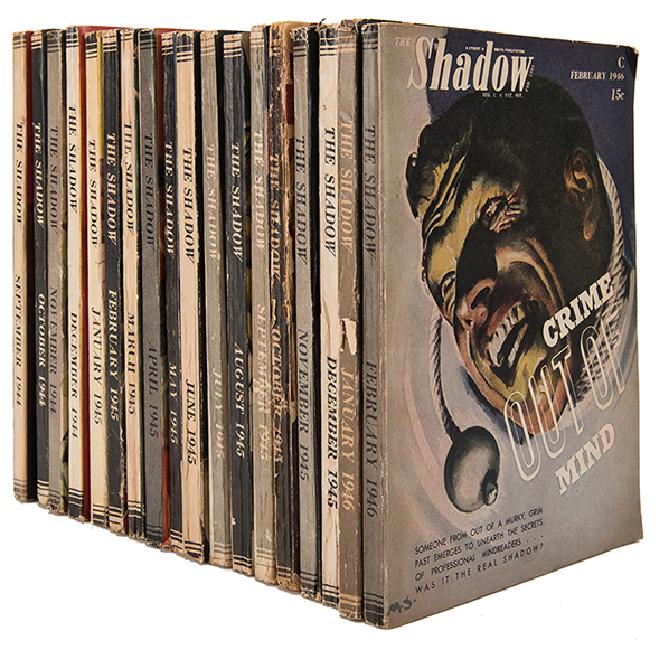 Gibson, Walter [Grant, Maxwell, pseud. ] The Shadow. Toronto: Street & Smith, September 1944-November 1946. Eighteen issues, comprising Vol. 48, Nos. 1-6, Vol. 49, Nos. 1-6, and Vol. 50, Nos. 1-6. 12mo, digest size. Illustrated printed wraps.
