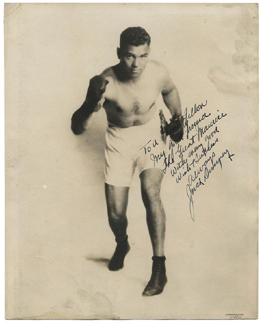 [Sport. Boxing] Dempsey, Jack. Inscribed and Signed Portrait Photograph. Cosmopolitan Studios, ca. 1920. Matte-finish sepia print, a full-length image of the boxer, inscribed and signed in black fountain pen: "To a great fellow/ my good friend the Great Maurice/ with every good wish & success always/ Jack Dempsey". 10 x 8". Margins smudged, scrapbook paper remnants on verso.