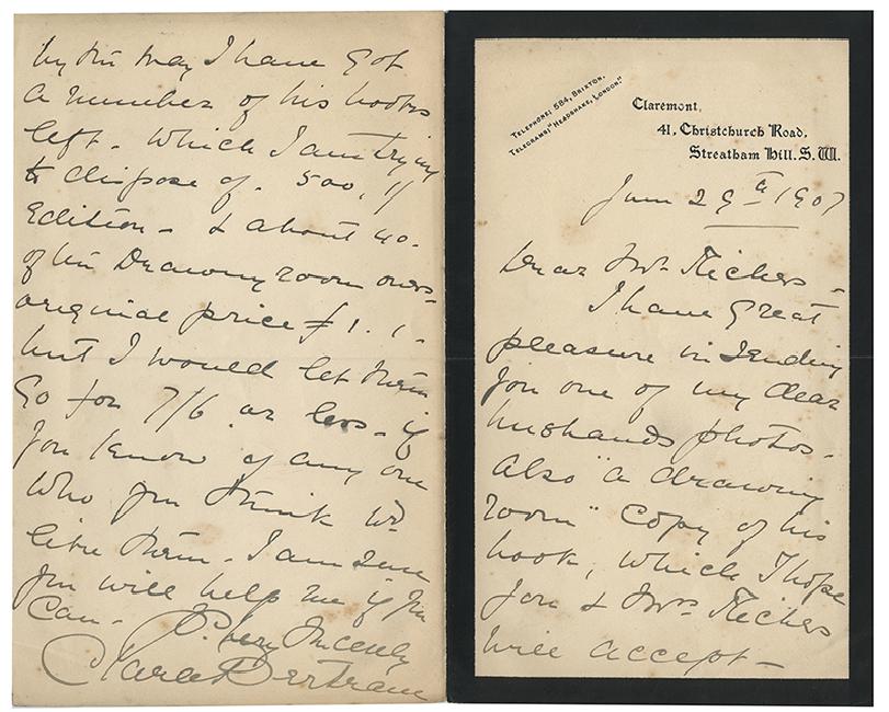Bertram, Charles. Cabinet Card Portrait Photograph, with a Letter from Bertram’s Wife. London, 1907. Sepia print portrait of the magician holding a deck of cards and standing at a table, on embossed studio mount (Campbell & Gray, 17 Cheapside, London). Gift inscription on verso by Bertram’s wife, Clara. 6 ½ x 4 ¼”. Accompanied by an autograph letter signed from Clara to the original owner, dated same as the photo.