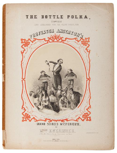 Anderson, John Henry. The Bottle Polka. New York: 1851. Three-color lithographed sheet music (composed by Kneringer) bearing an oval vignette of the magician performing the Inexhaustible Bottle, paged: [2] 3—5. 13 ½ x 10 ½”. Disbound; tape repair along left margin.