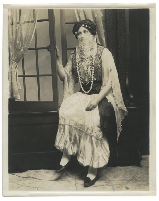 Two Crystal Gazing Photographs. Indianapolis: Patton Studio, ca. 1920. Matte-finish silver gelatin prints, the first showing the magician seated beside his assistant, both dressed in performance attire, while he holds a crystal ball; the second showing the assistant alone seated at a window sill. Former image (9 x 7 ½”) trimmed just inside margins with metal grommets in the corners. Latter 10 x 8”.
