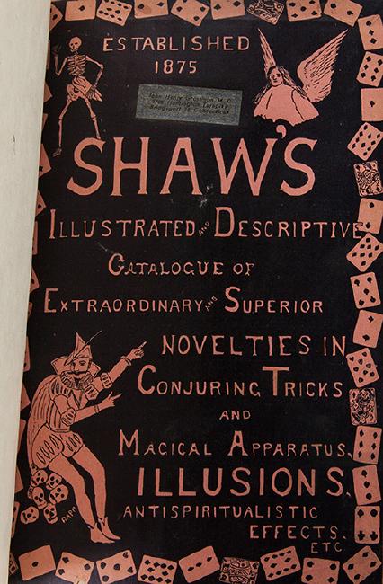 W. H. J. Shaw Magic Catalog. Chicago, ca. 1894. Pink pictorial wraps, bound in modern red board with gilt stamped spine. Ex-libris Dr. John Henry Grossman. Fading to pink interior papers; very good. “Novelties in conjuring tricks and magical apparatus, illusions, antispritualistic effects, etc.”