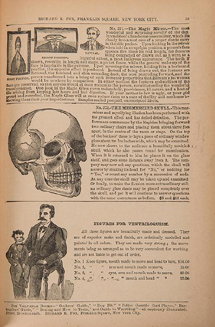 Richard K. Fox Illustrated Catalogue of Conjuring Tricks. New York, ca. 1880. Original pictorial wrappers, front bearing a woodcut vignette of a conjuring shop, retained in patterned buckram, gilt spine. 48 pages. Illustrated. 4to. Cut signature of the proprietor laid in on the front pastedown. Very good.