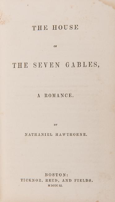 Hawthorne, Nathaniel. The House of Seven Gables. Boston: Ticknor, Reed and Fields, 1851. First edition, later issue, with ads dated July 1853. Publisher’s brown cloth. 8vo. Binding cocked; boards rubbed with tears to spine ends and some loss. Brown stain to edge of a number of pages at the end.