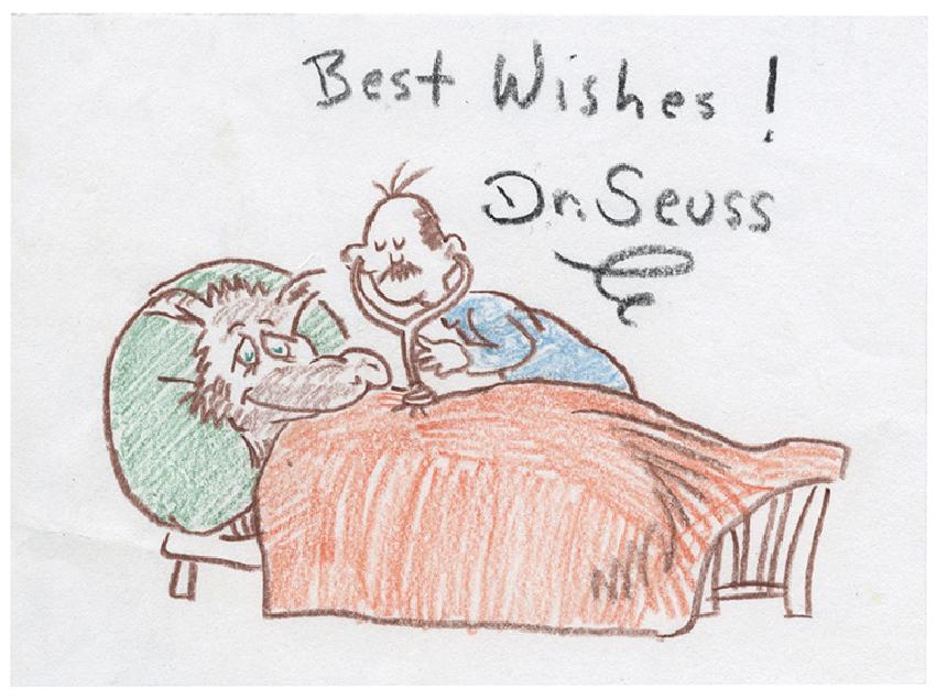 Geisel, Theodore [a/k/a Dr. Seuss]. Signed Drawing. Colored pencil on paper, inscribed "Best Wishes! / Dr. Seuss." 3 1/2 x 4 1/2".