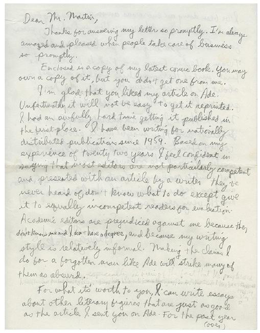 Pekar, Harvey. Autographed Letter Signed. Two pages, to Mr. Martin, n.d. Regarding an article he wrote about George Ade and the difficulties of being taken seriously as a comic book writer. Pekar states, "All academic editors are prejudiced of me because they don’t know me and I don’t have a degree, and because my writing style is relatively informal."